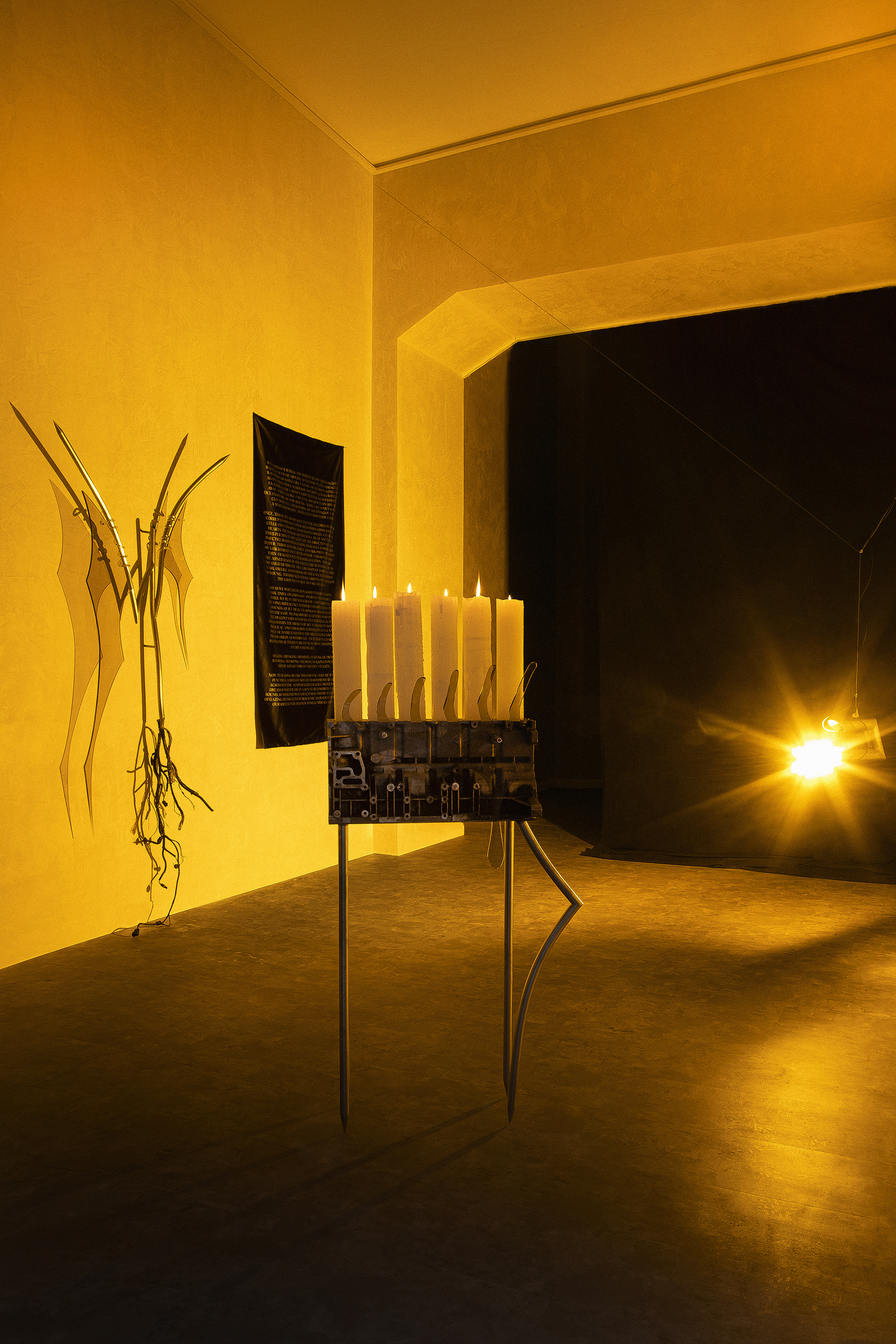 With their project Maps of the Untamed Threshold, Alagya focuses on the lived experience of the necrocene. The audio piece at the center of the installation recalls personal stories from both cellular and global levels to explore how body and identity are shaped and defined by new technologies.